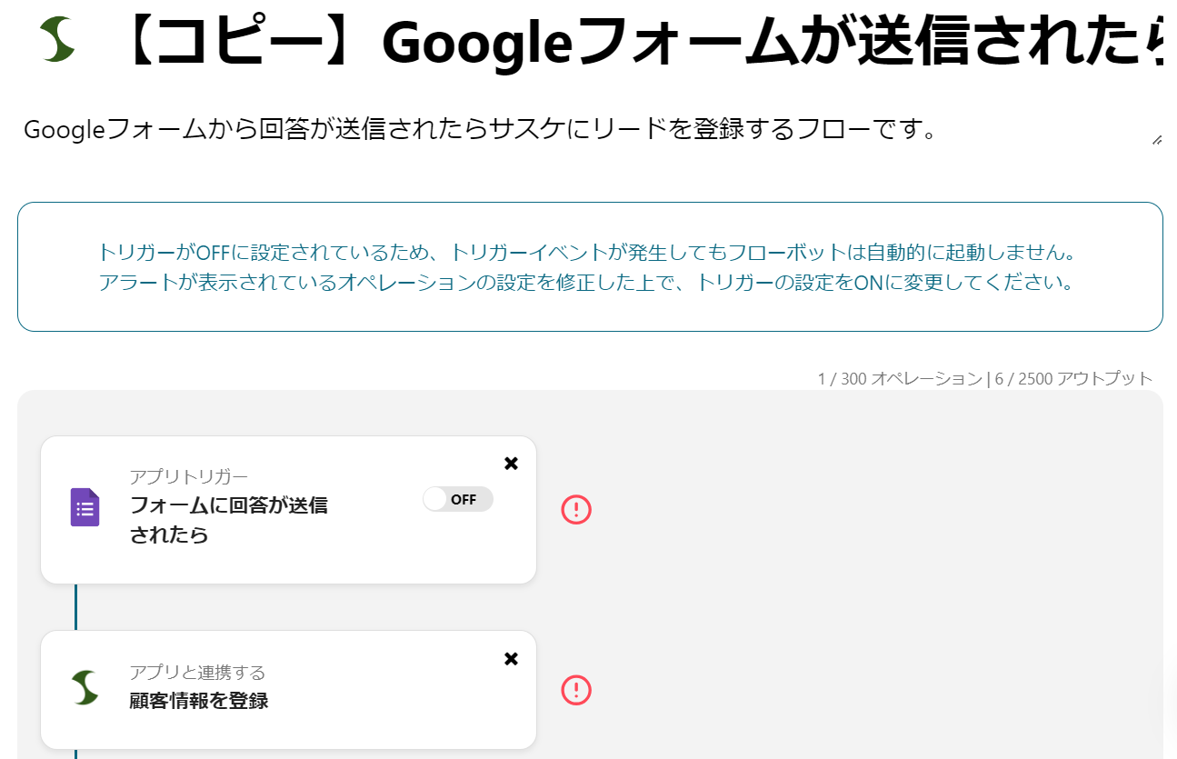 今回は「Googleフォームが送信されたらサスケにリードを登録する」という以下のテンプレートの設定をご紹介します。