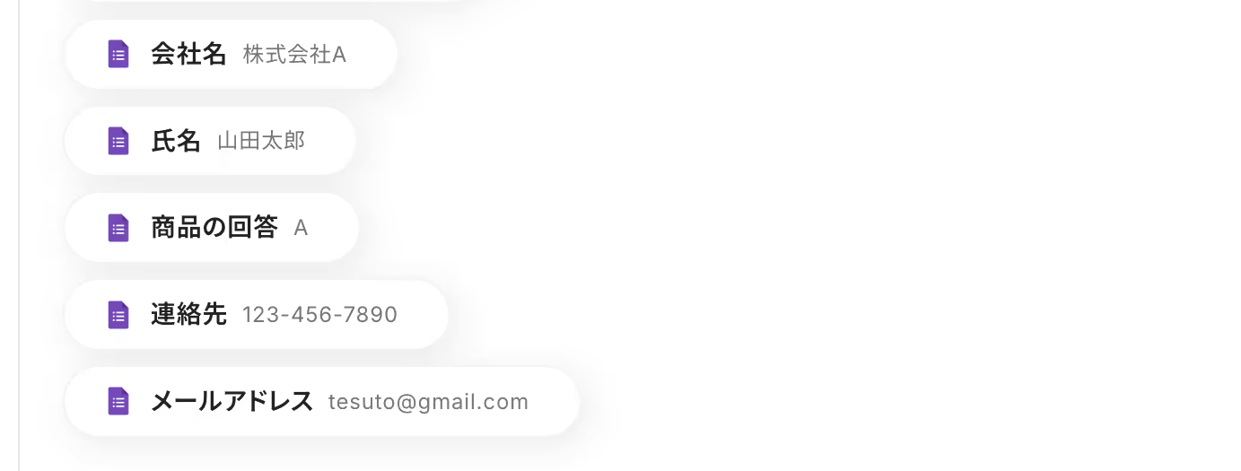 取得した値の中を見てみると、フォームに回答した内容(会社名や氏名など)が取得した値として表示されていないことが分かります。