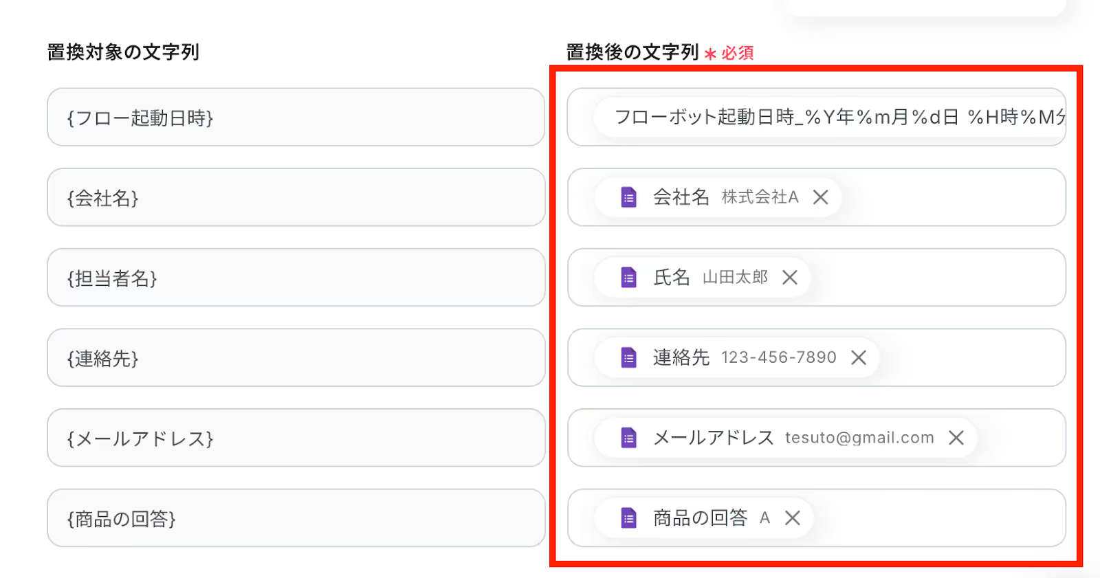 「置換後の文字列」を、ステップ3で取得した値を活用して入力していきます。