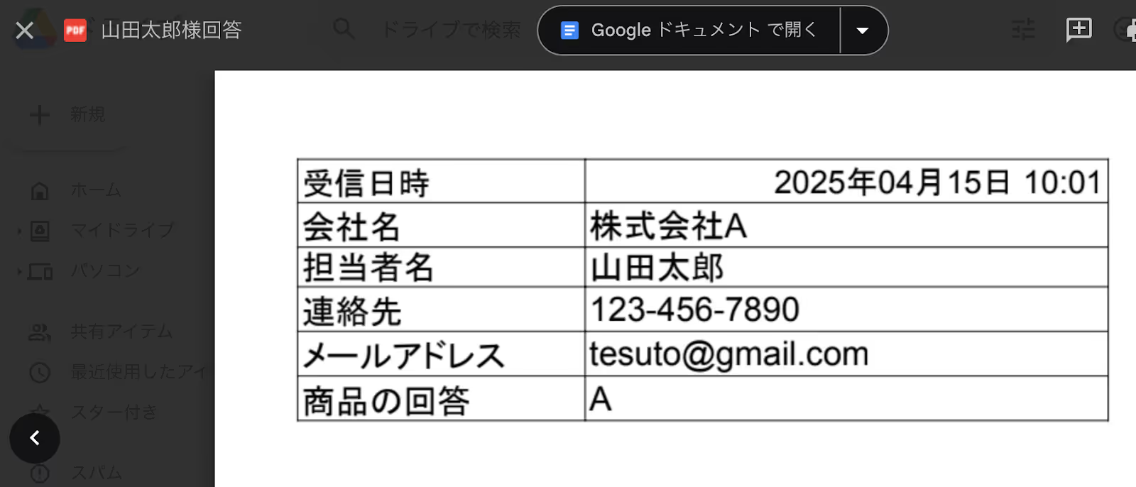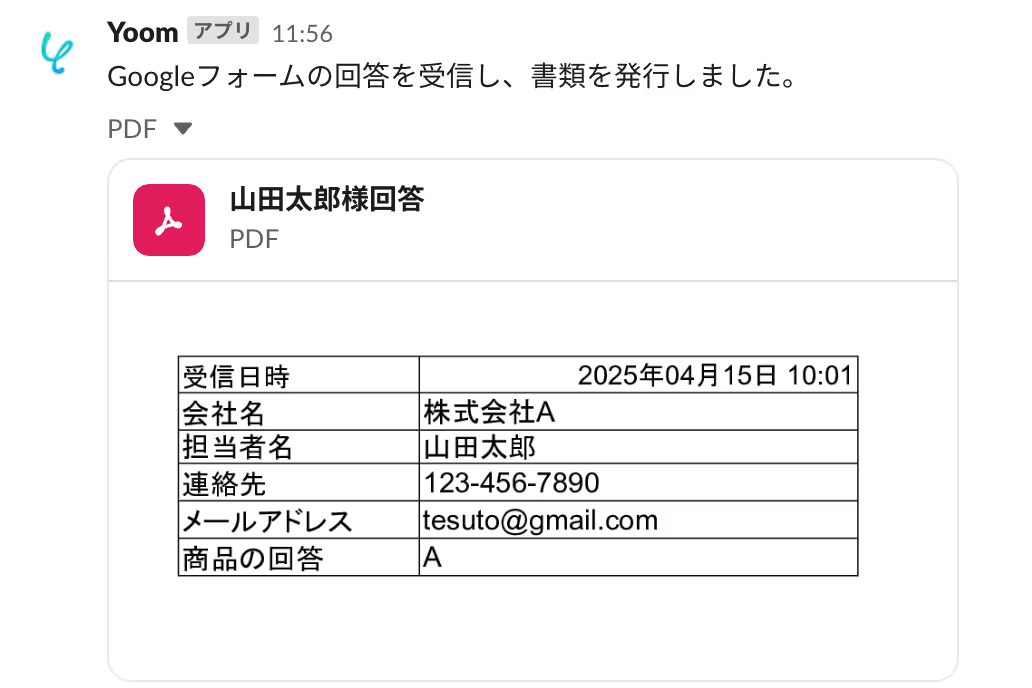 たとえば、Googleフォームに回答が送信されると同時に、内容をPDF化してSlackに自動で投稿することが可能です。わざわざファイルを開いて保存・共有する必要はなく、Slackを開くだけで確認や記録が完了します。