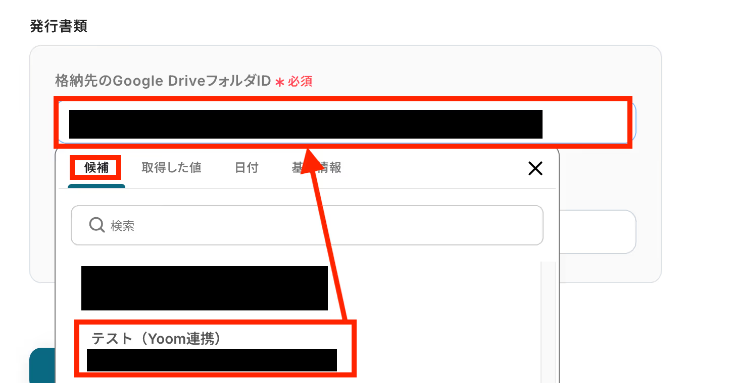「格納先のフォルダID」も同様に候補から選べます。