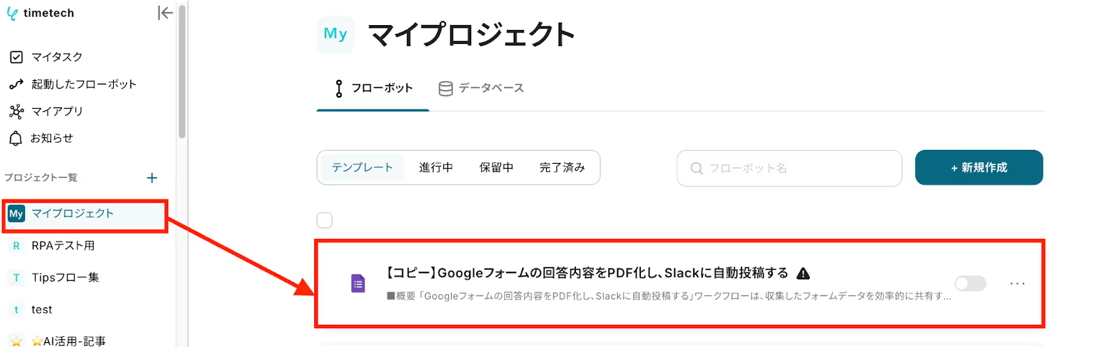 左側にあるメニューの「マイプロジェクト」から、コピーしたテンプレートを開きます。