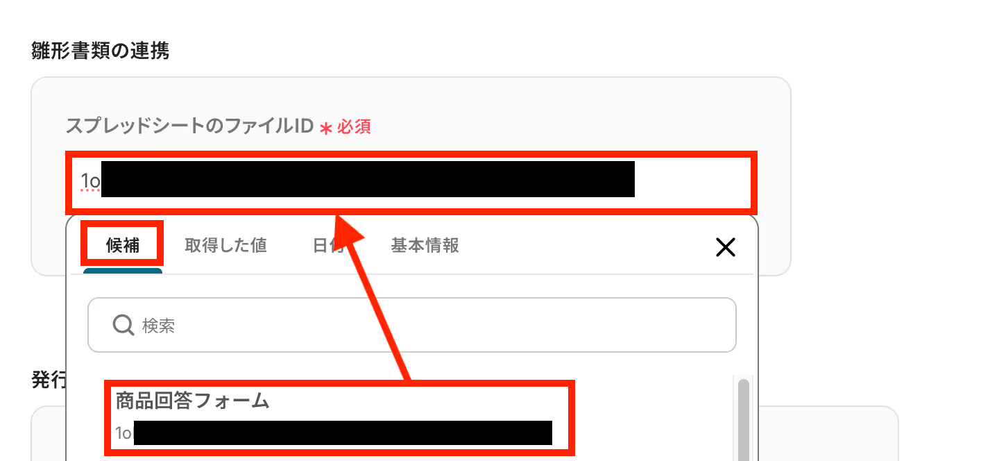 「ファイルID」は入力欄をクリックすると候補が表示されるので、その中から選ぶと簡単です!