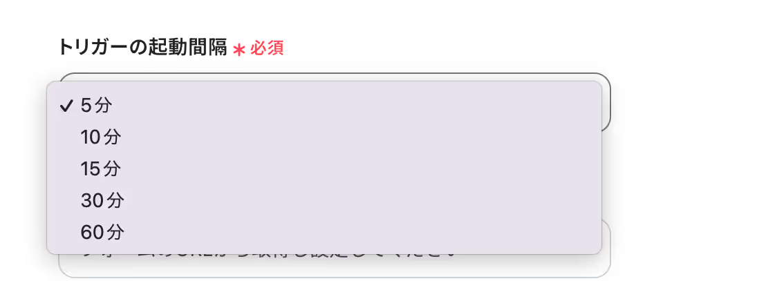 「トリガーの起動間隔」を5分・10分・15分・30分・60分から選択します。