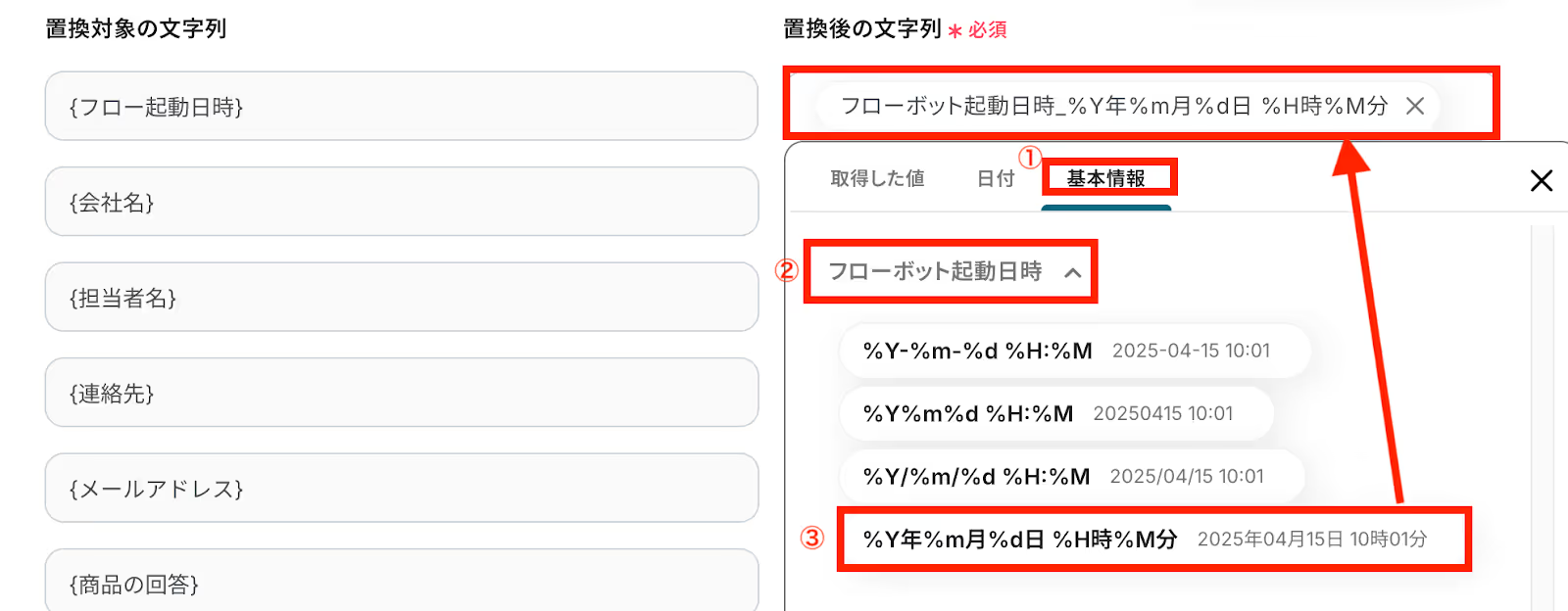 もし、フローボットの起動日時を入れたい場合には「基本情報」の欄から選ぶことができます。