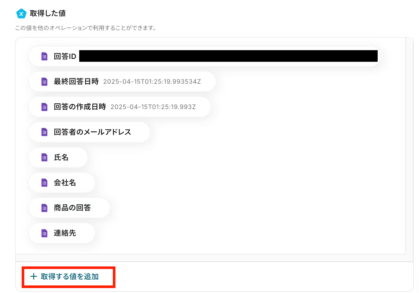 フォームへの回答項目を取得するためには「取得する値」を追加する必要があります。