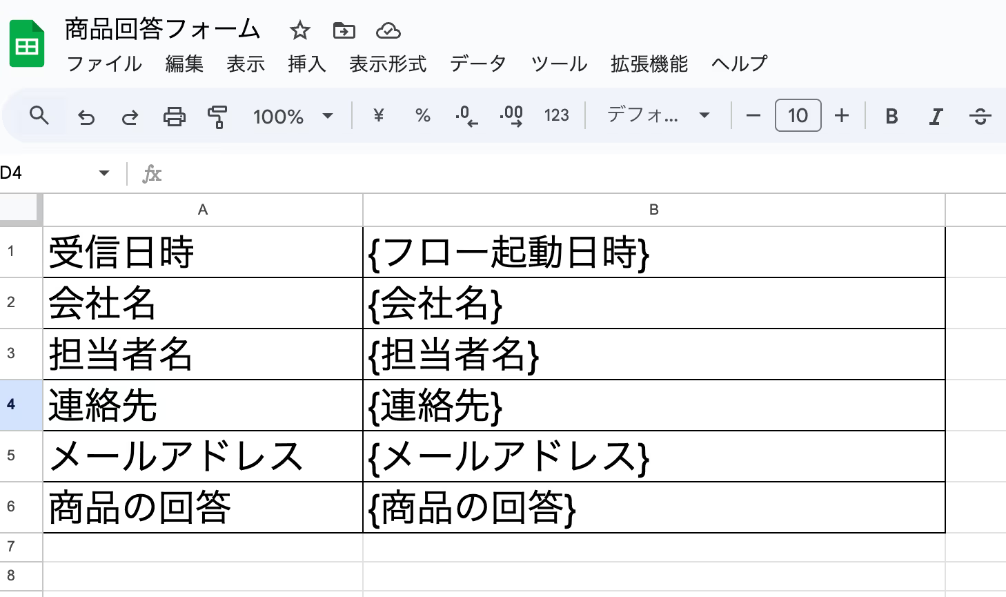 Googleフォームに合わせたシートを事前に作成しましょう。