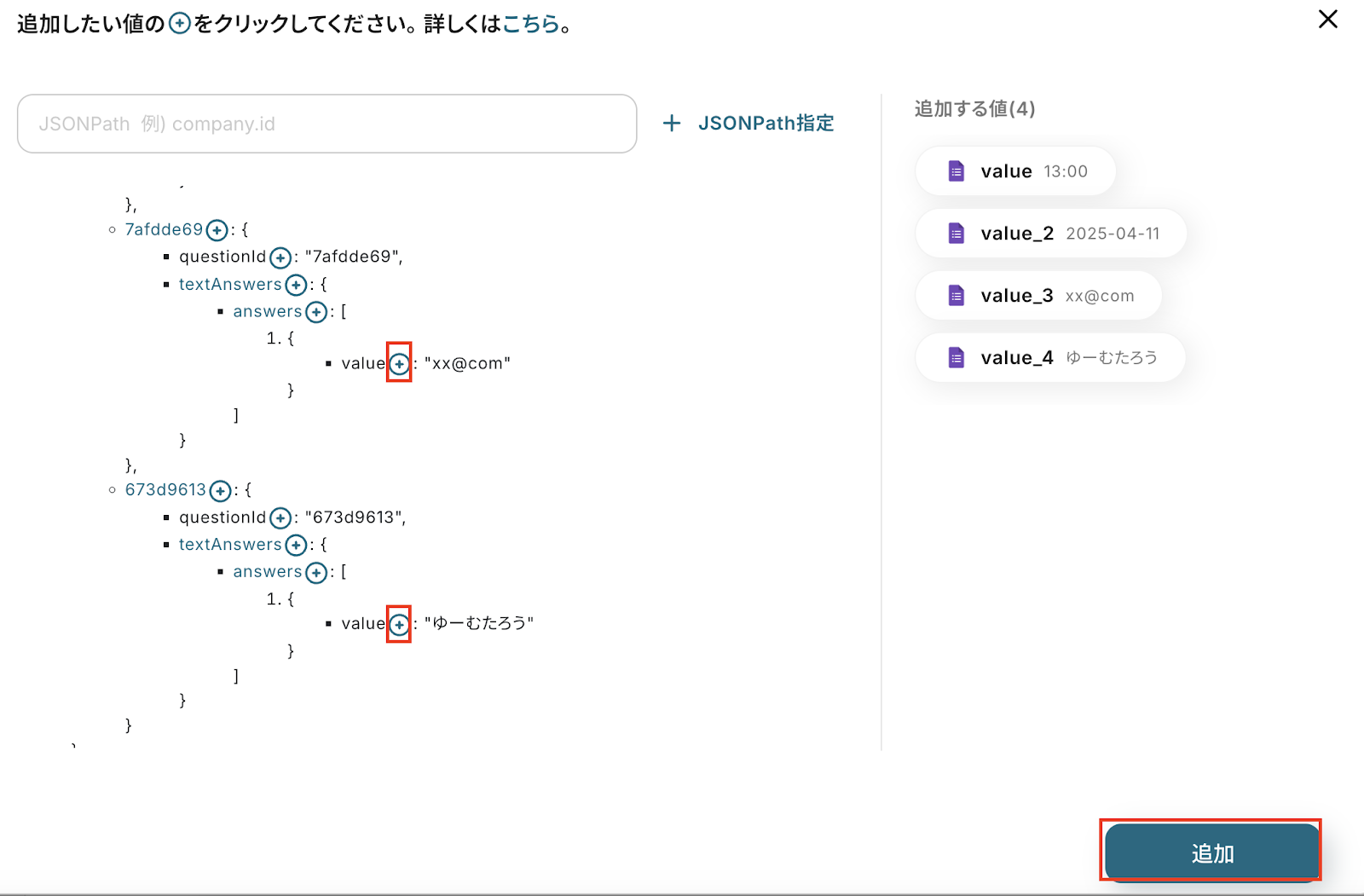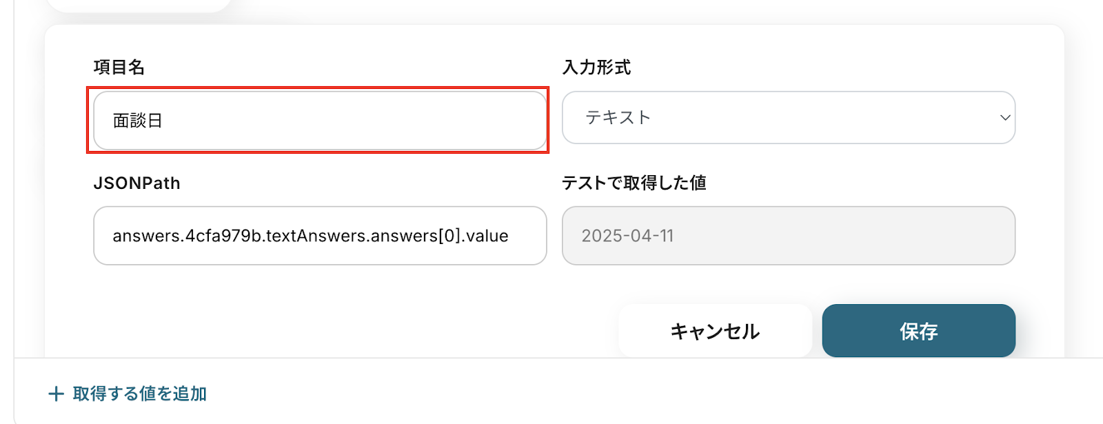 テストが成功したら、「取得する値を追加」から手動でGoogleフォームの回答情報を追加します。