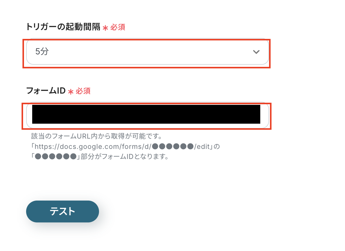 設定後、トリガーとなるアクション(フォームに回答が送信されたら)を実行して、テストをクリックしましょう。