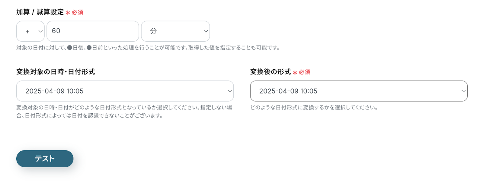 ここで「取得する値」を使わずに手入力してしまうと、同じ時間を変換し続けることになります。