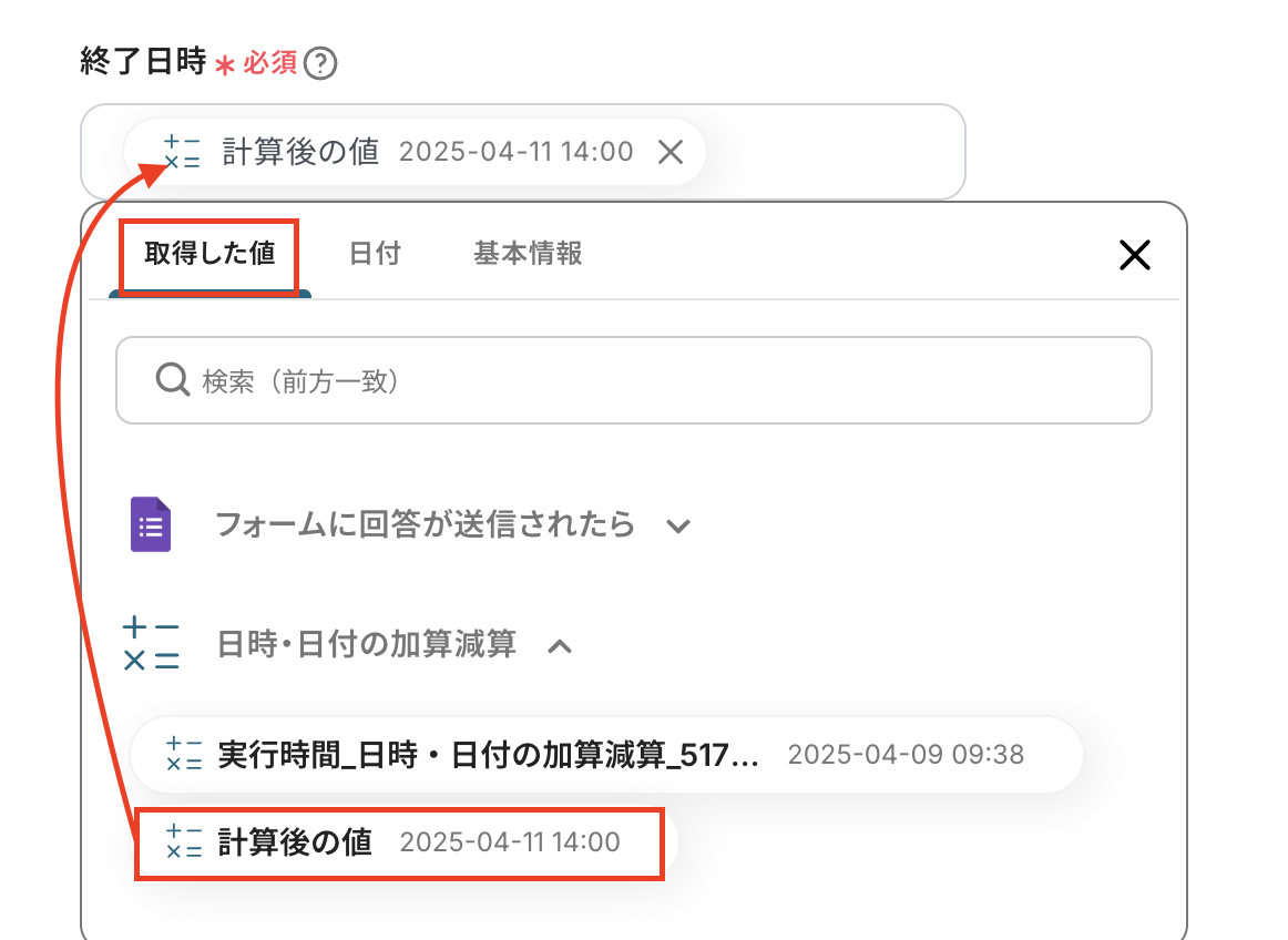 終了日時は日時・日付の加算減算の取得した値から「計算後の値」を選択してください。