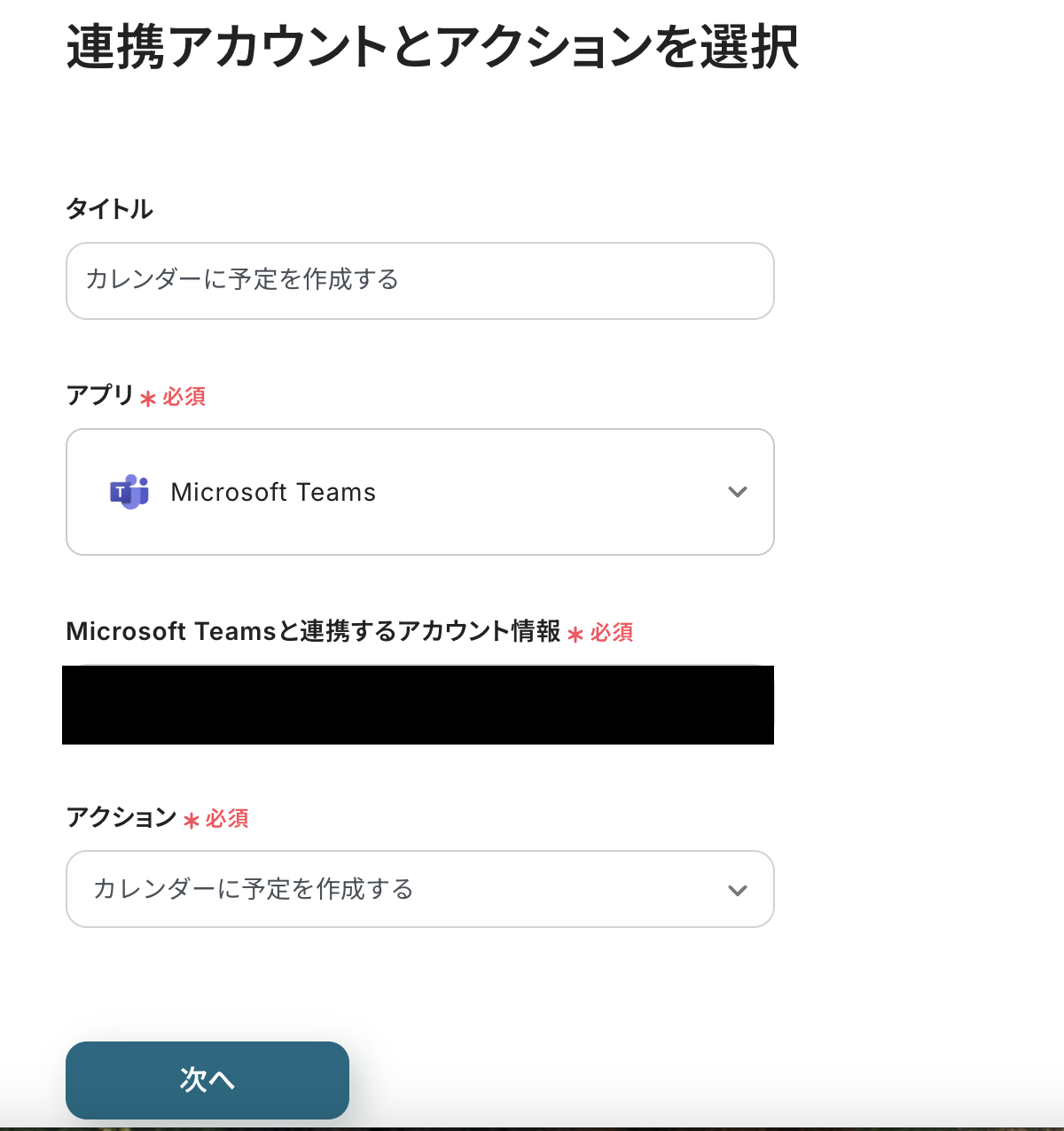 アクションは「カレンダーに予定を作成する」が選択されていることを確認後、次へをクリックします。