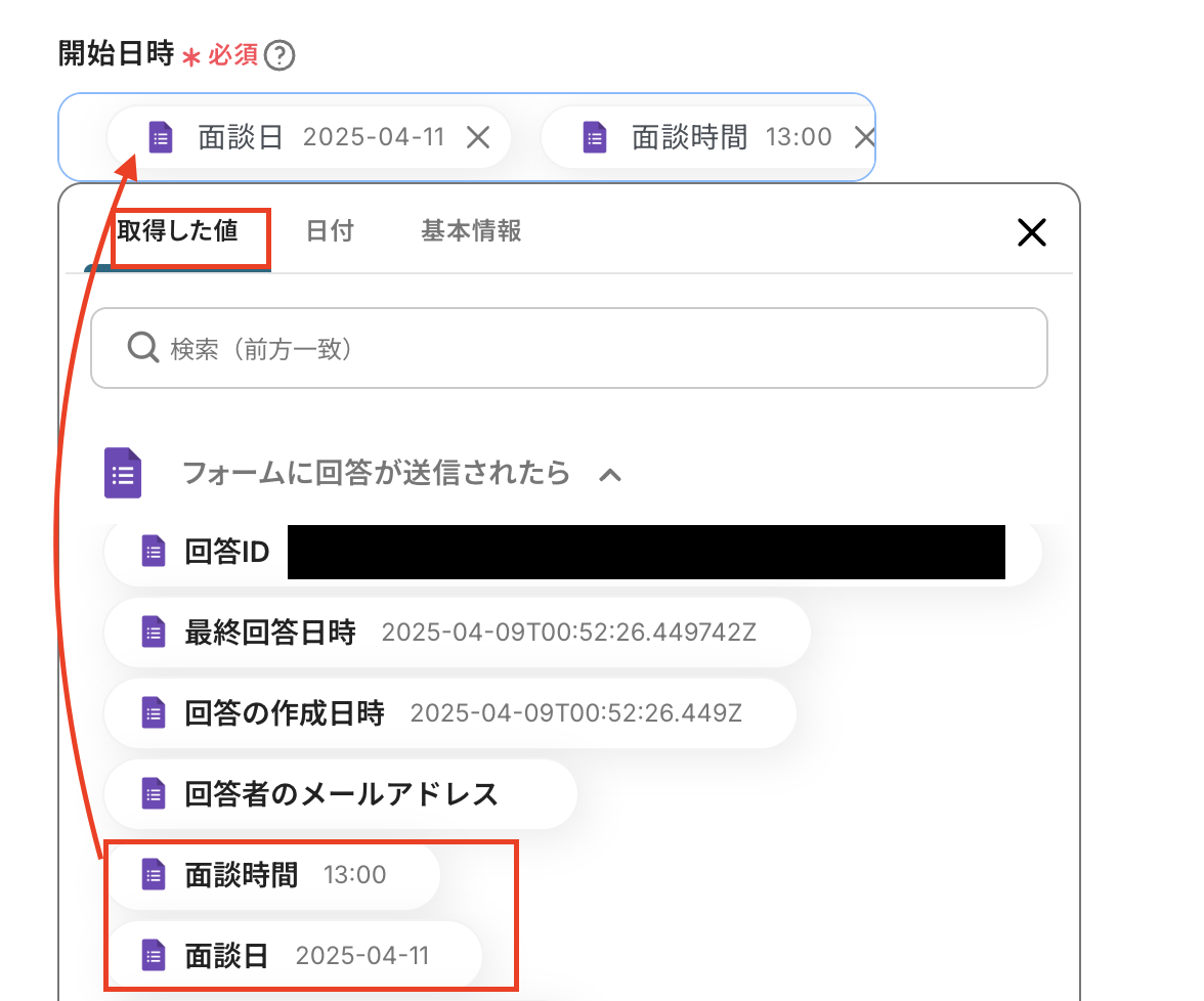 開始日時はGoogleフォームの取得した値から「面談日」「面談時間」を選択しましょう。