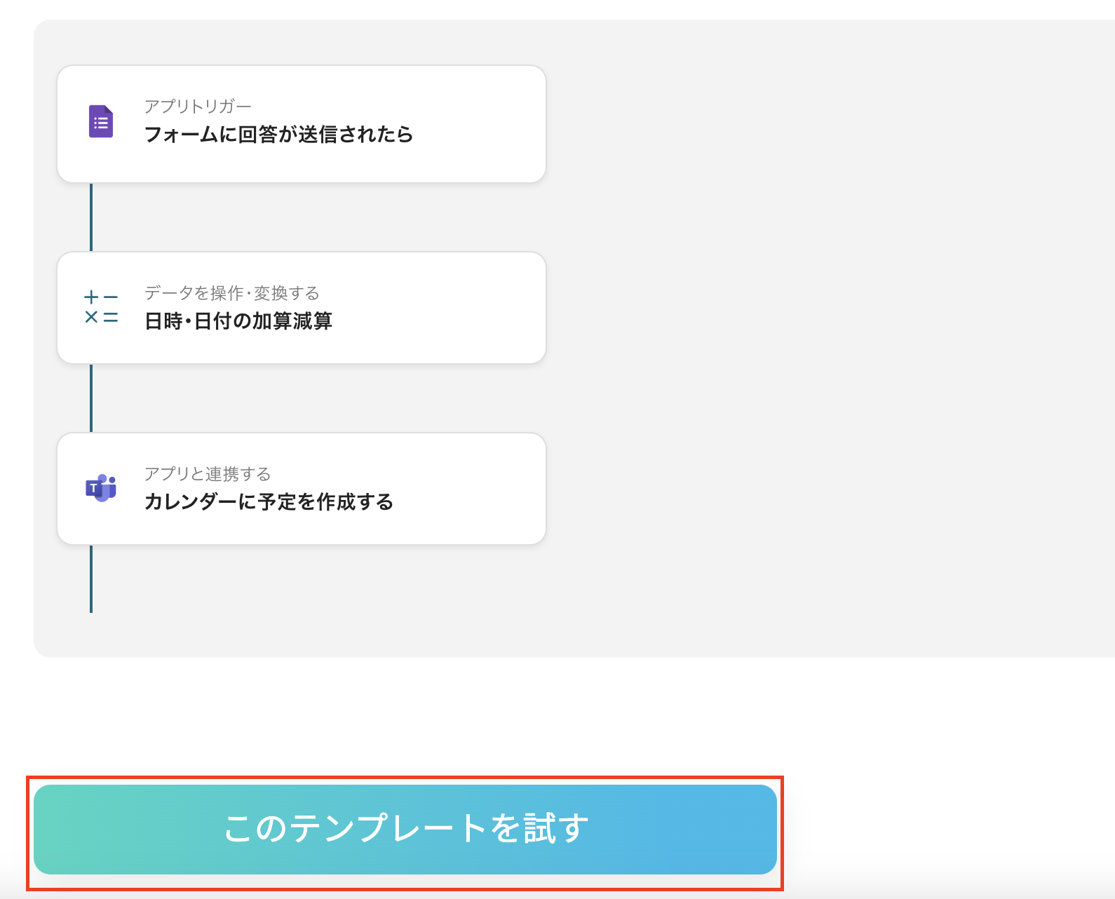 「Googleフォームの回答内容からMicrosoft Teamsでカレンダーに予定を作成する」フローは、イベントや会議のスケジュール管理を効率化する業務ワークフローです。Googleフォームで収集した情報を自動的にMicrosoft Teamsのカレンダーに反映させることで、手動での入力作業を削減し、スムーズなスケジュール調整が可能になります。これにより、チーム内でのコミュニケーションや予定管理がより円滑に進むことが期待できます。
