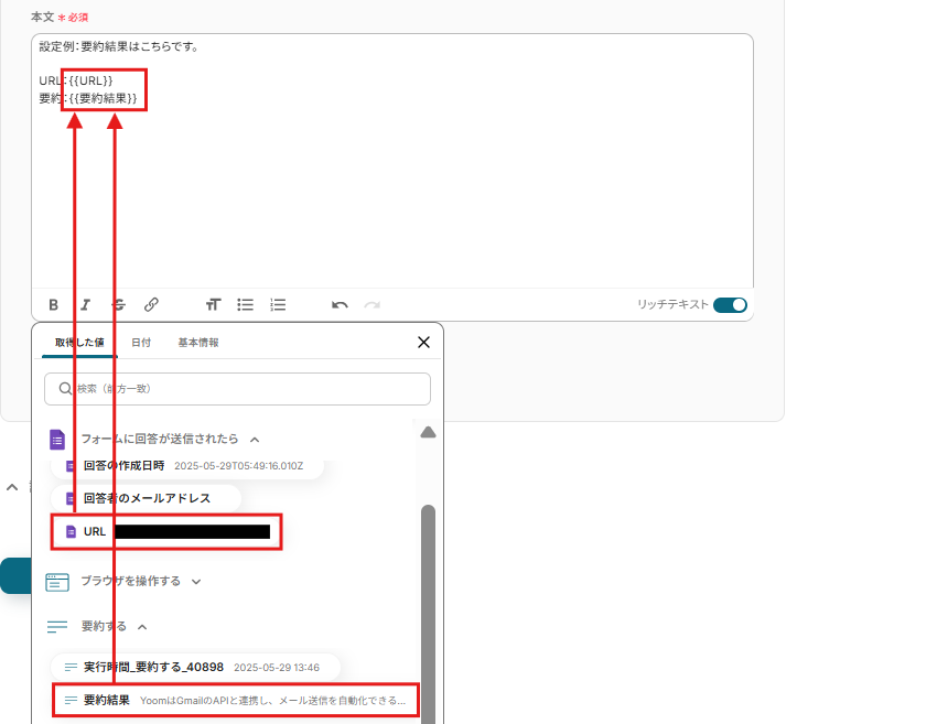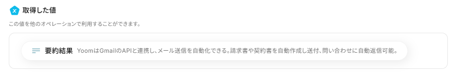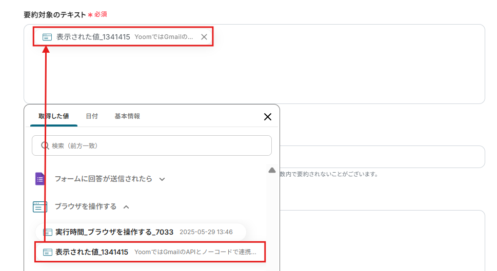 要約対象のテキストは取得した値の「表示された値」から入力してください。