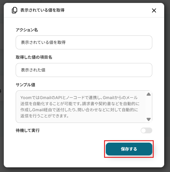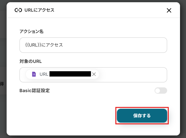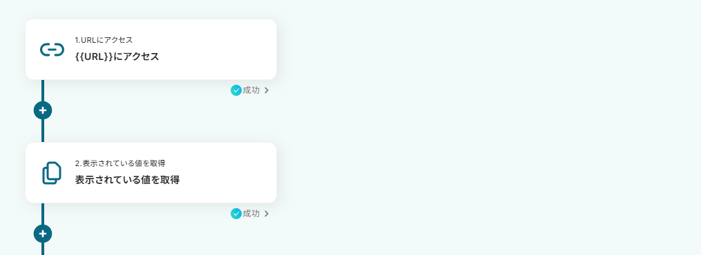 「URLにアクセス」と「表示されている値を取得」の右下の成功を確認したら、右下の「保存する」をクリックして次に進みます。