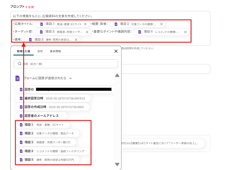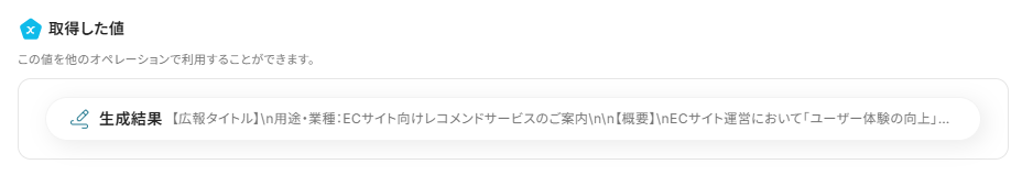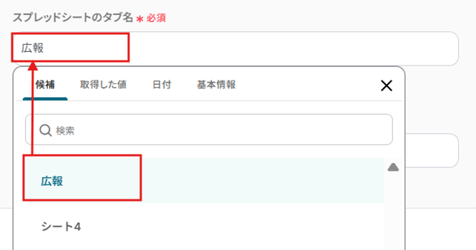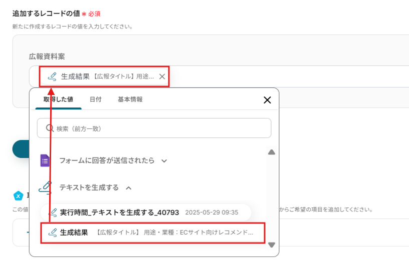 該当欄に、取得した値から生成結果を選択します。