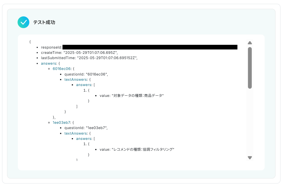 ・Googleフォームをトリガーとして使用した際の回答内容を取得する方法は下記をご参照ください。
