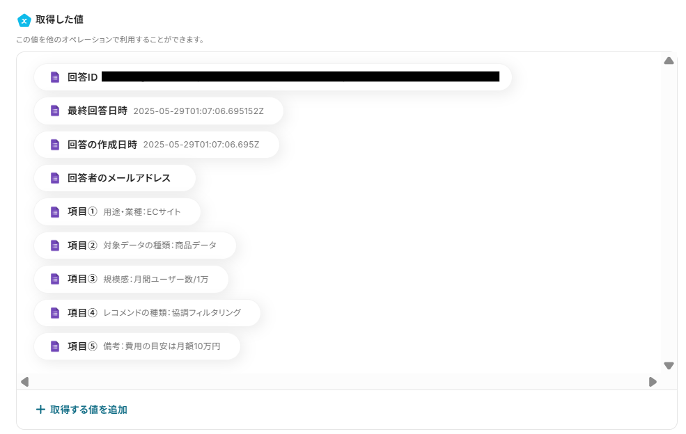 項目が足りない場合、「取得する値を追加」から追加してください。