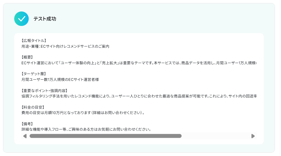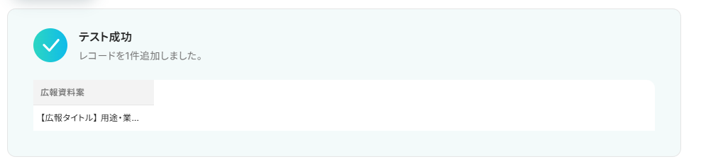 このワークフローを活用すれば、Googleフォームで集めた回答をAIが自動で分析し、広報資料のドラフトをスムーズに作成します。