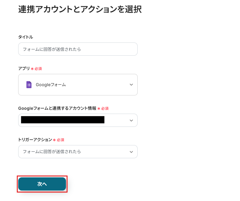 以下の画面が出てきたら、タイトルと連携するアカウント情報を任意で設定し、アクションはテンプレート通りのまま「次へ」をクリックして進んでください。