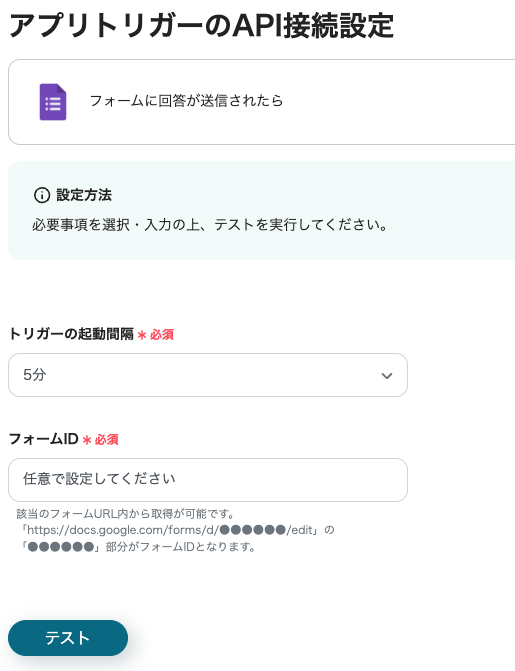 「フォームID」は、注釈を参考にして、該当のフォームURLから取得し入力しましょう。