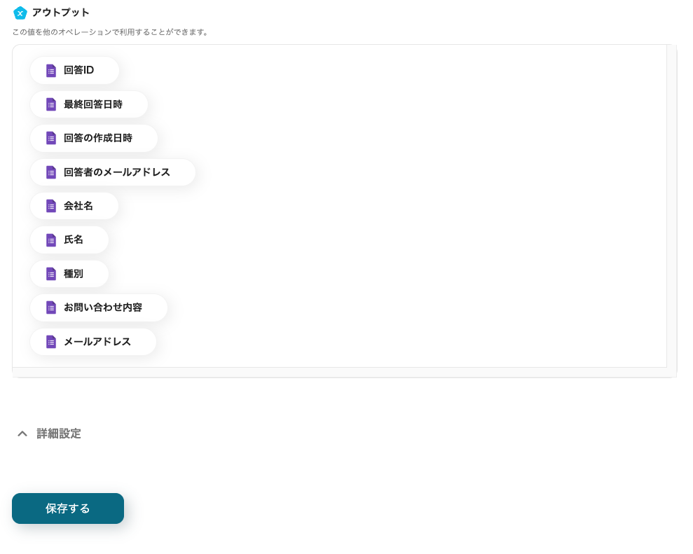 回答情報がアウトプットに表示されていることを確認したら、「保存する」をクリックしてください。