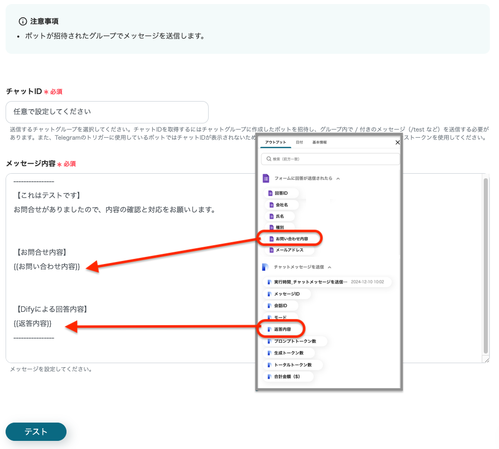 「メッセージ」は任意編集が可能で、欄をクリックすると、GoogleフォームまたはDifyから取得した情報を引用できます。今回は「お問い合わせ内容」と「返答内容」を含むメッセージを作成しました。