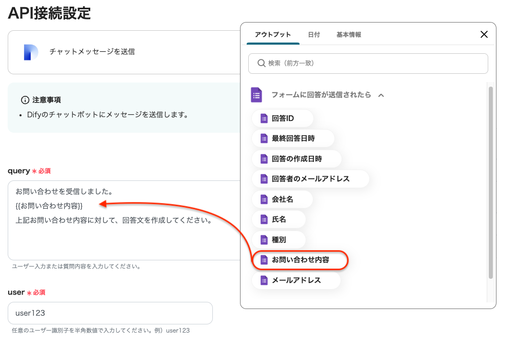 Difyは送信されたメッセージに基づき回答内容を生成するため、「お問い合わせ内容」を含むメッセージを「query」に入力しましょう。
