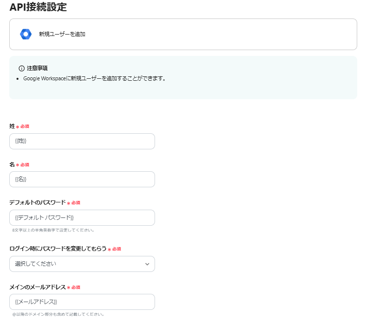 ※Google Workspaceはチームプラン・サクセスプランでのみご利用いただけるアプリとなっております。フリープラン・ミニプランの場合は設定しているフローボットのオペレーションやデータコネクトはエラーとなりますので、ご注意ください。