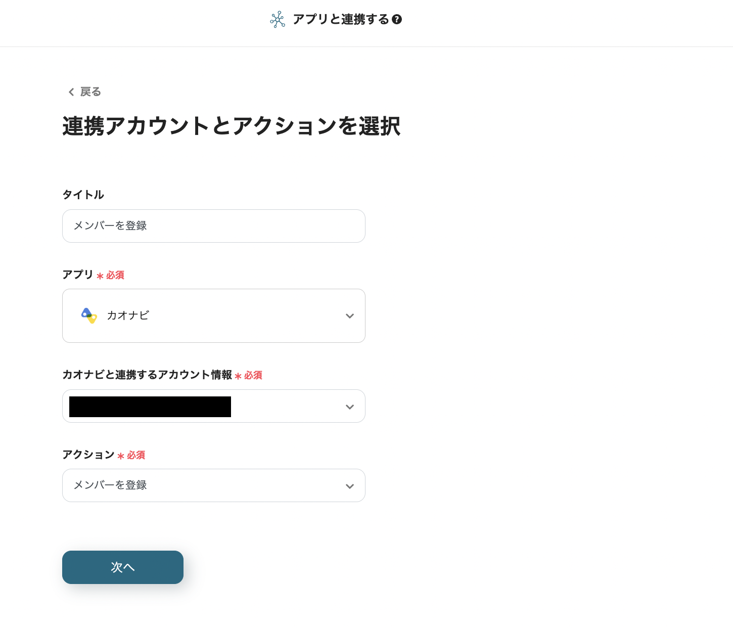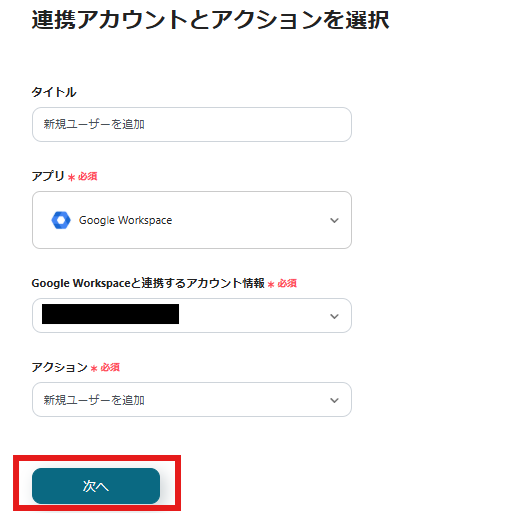 次はGoogle Workspaceの連携アカウントとアクションを選択します。