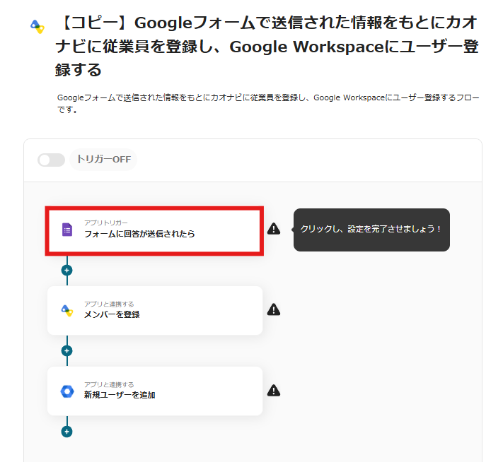 それではここからノーコードツールYoomを使って、Googleフォームで送信された情報をもとにカオナビに従業員を登録し、Google Workspaceにユーザー登録する方法をご説明します。