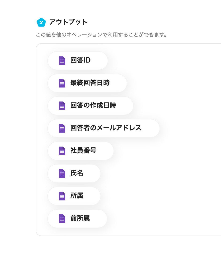 入力欄で表示されたアウトプットからGoogleフォームで回答された内容を引用することもできます。