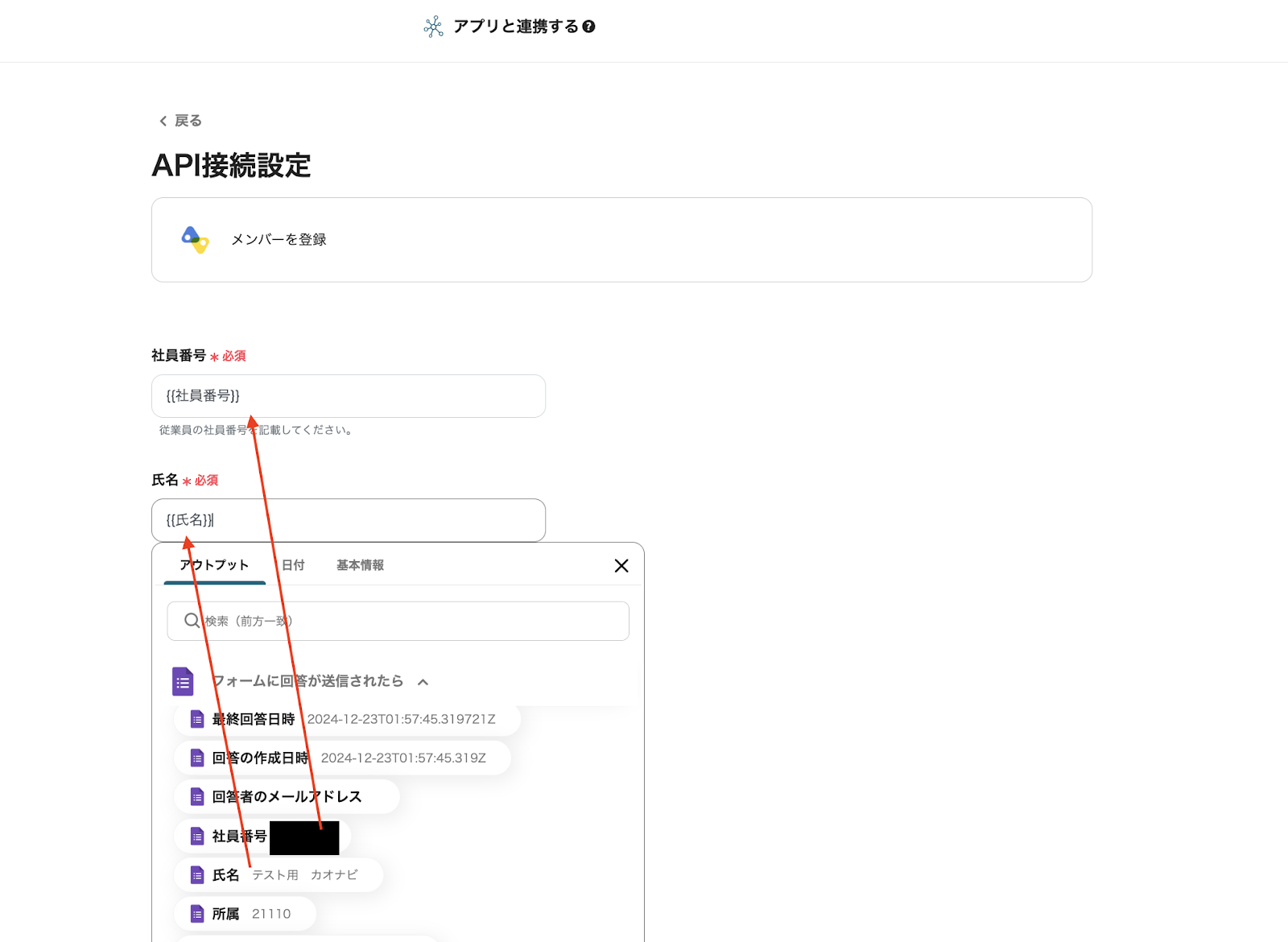 API接続設定を行うにあたり、「社員番号」「氏名」を下記のように入力します。