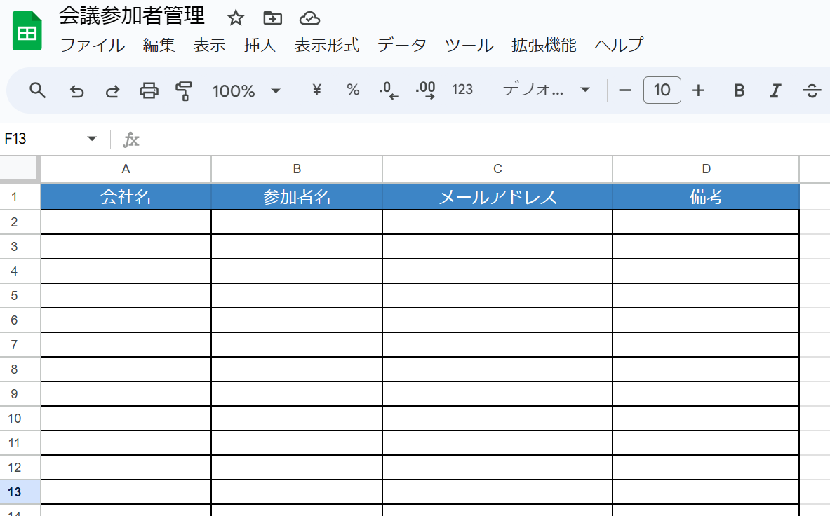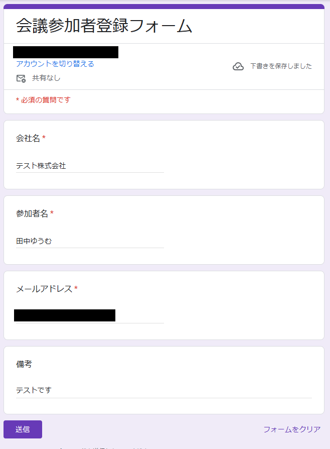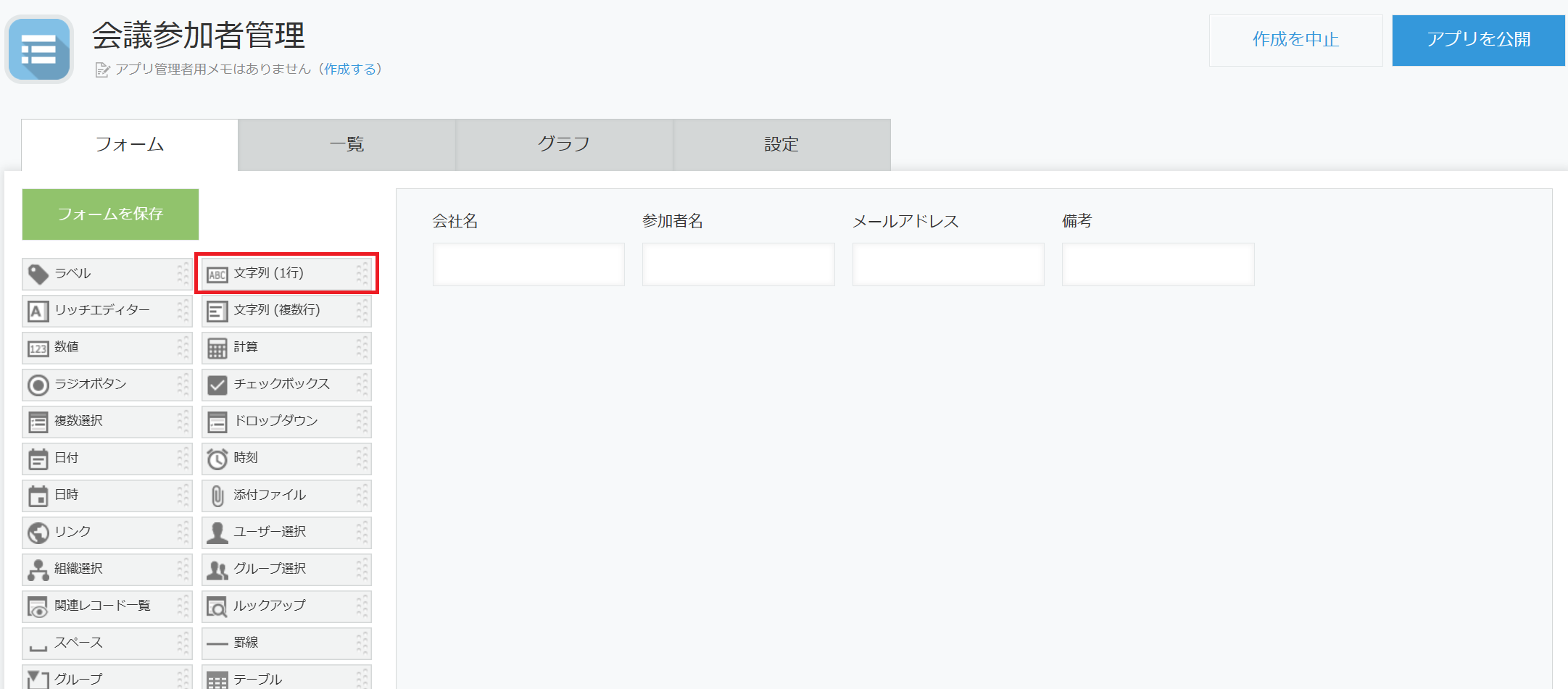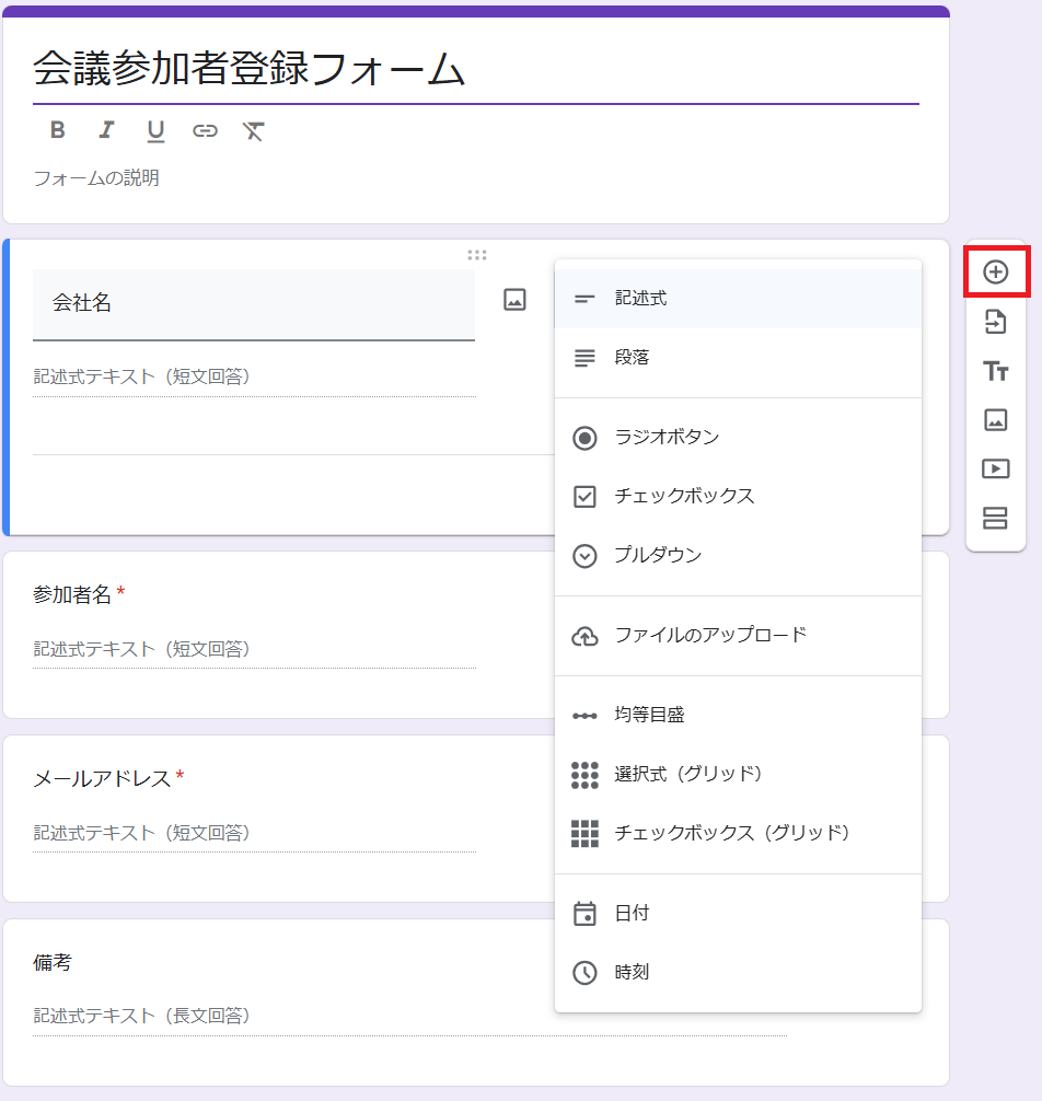 今回は項目名を「会社名、参加者名、メールアドレス、備考」にしました。
