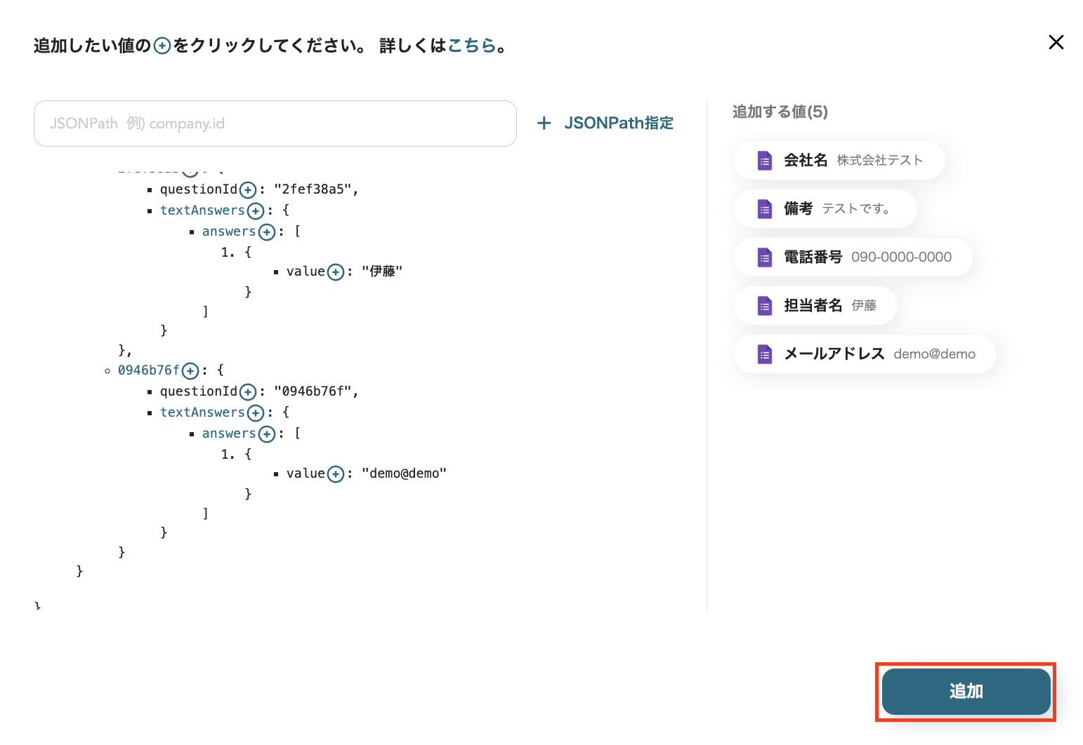 以下のように項目を追加、編集が完了したら「追加」をクリックしましょう。