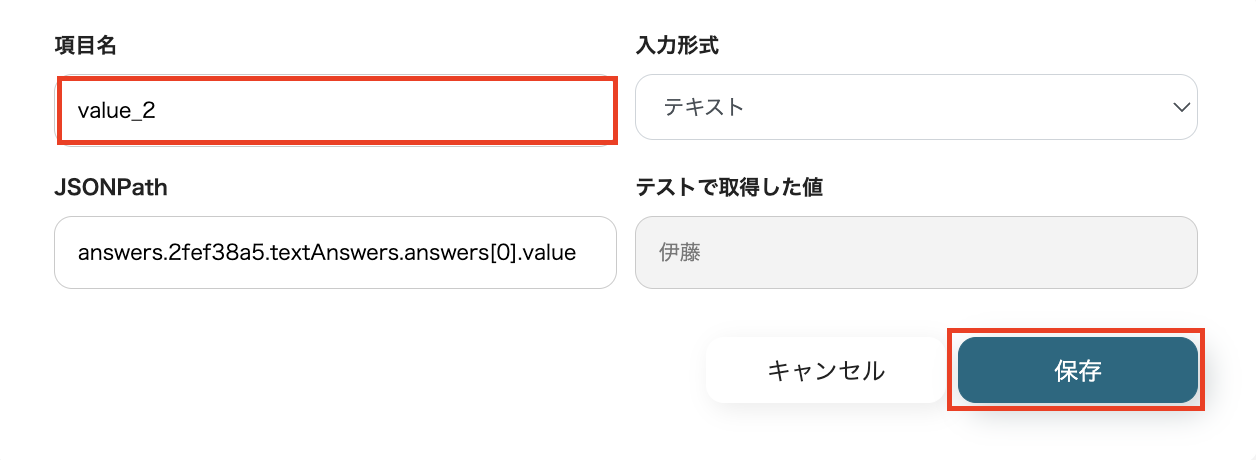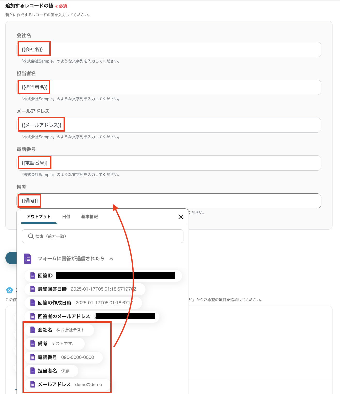 Googleフォームとkintone、同一の項目が設定されているので、kintoneの項目の中にGoogleフォームで取得したアウトプットを設定します。