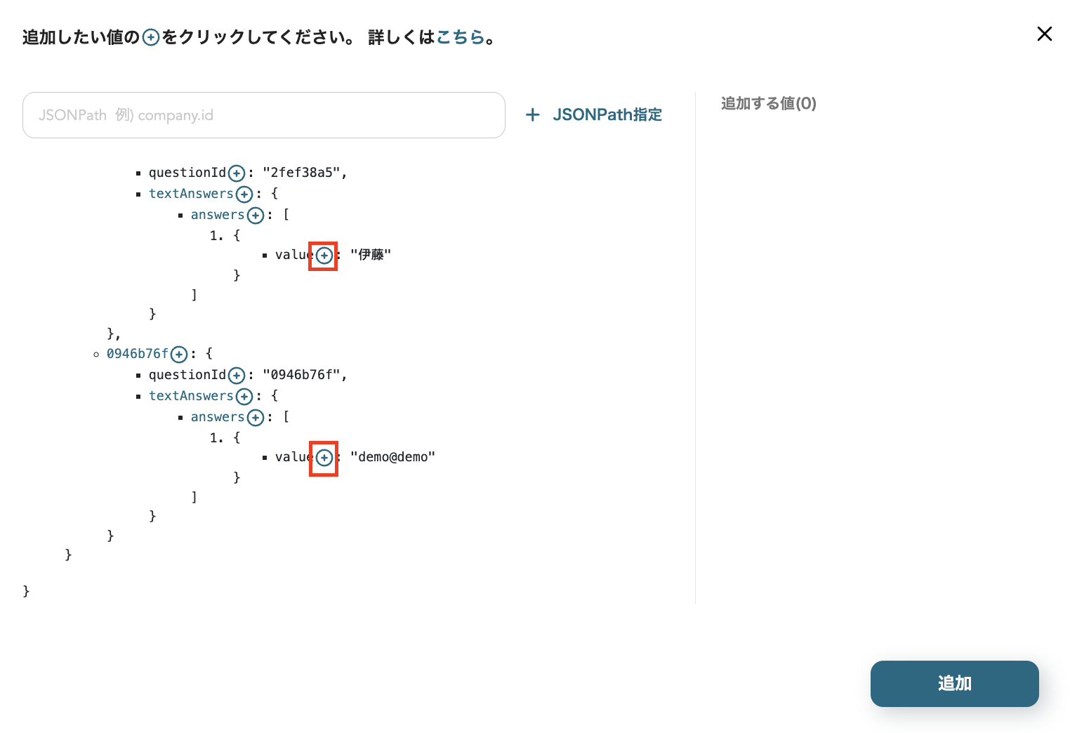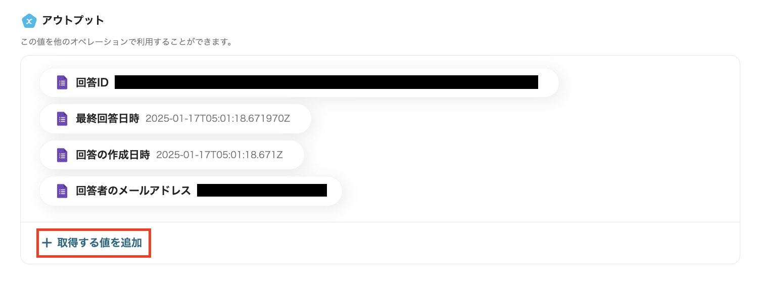 デフォルトで取得できるアウトプットではGoogleフォームの回答内容が取得されないため、手動でアウトプットの追加を行いましょう。
