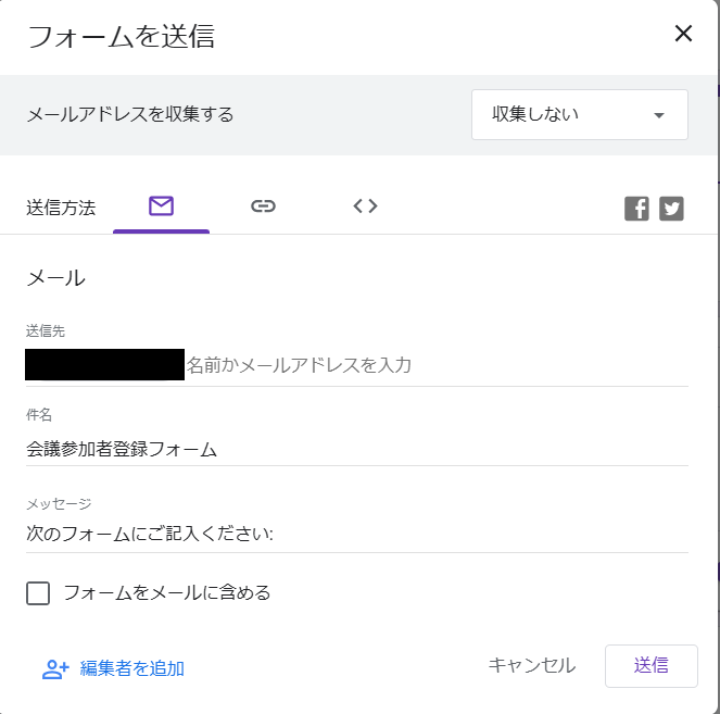 3.右上の送信ボタンをクリックし、自分のメールアドレスを入れてフォームを送信します。