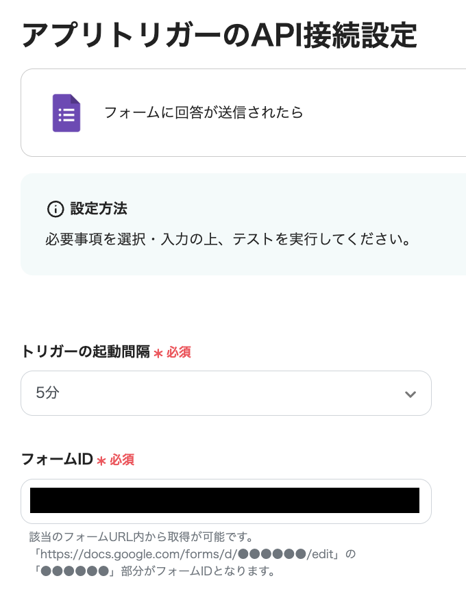 「フォームID」→作成したフォームのURLから取得し、設定してください。