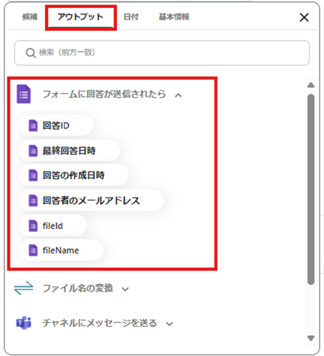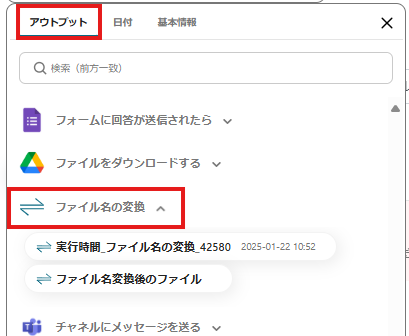 クリックすることで候補が出てきますので、その中から選択してください。ファイル名は先ほどと同様に、アウトプットのファイル名変換から選択します。