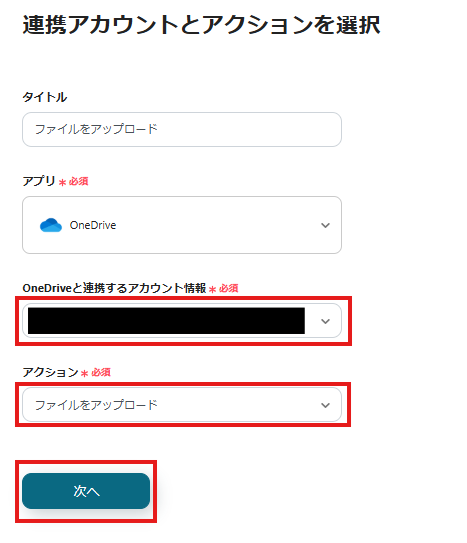 OneDriveと「連携するアカウント情報」に間違いないか確認し、アクションがファイルをアップロードになっていることを確認し、「次へ」をクリックします。