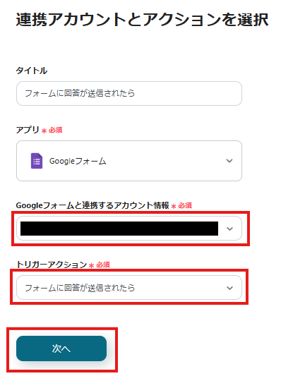 トリガーアクションが「フォームに回答が送信されたら」になっていることを確認し、次へ進みます。