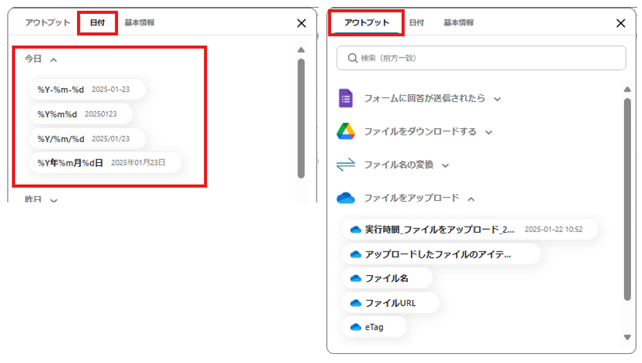 例えば、クリックすることで、日付の表示形式を選ぶことが出来たり、アウトプットからURLの情報を貼り付けることも出来ます。