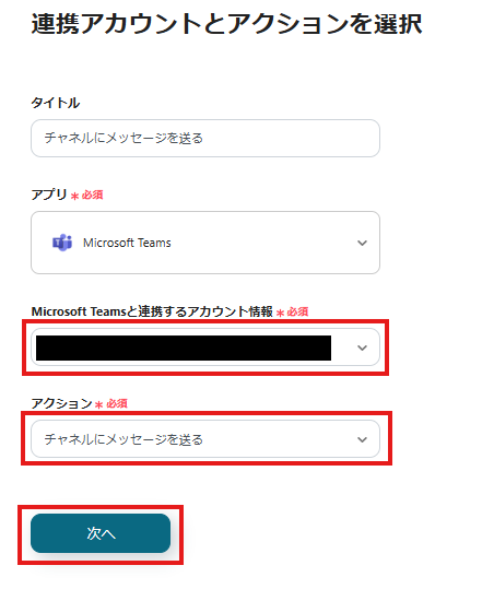 アクションが「チャネルにメッセージを送る」になっていれば、次へをクリックしてください。