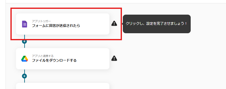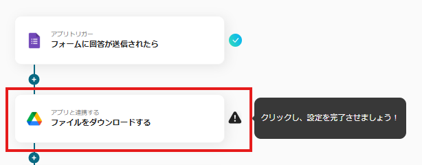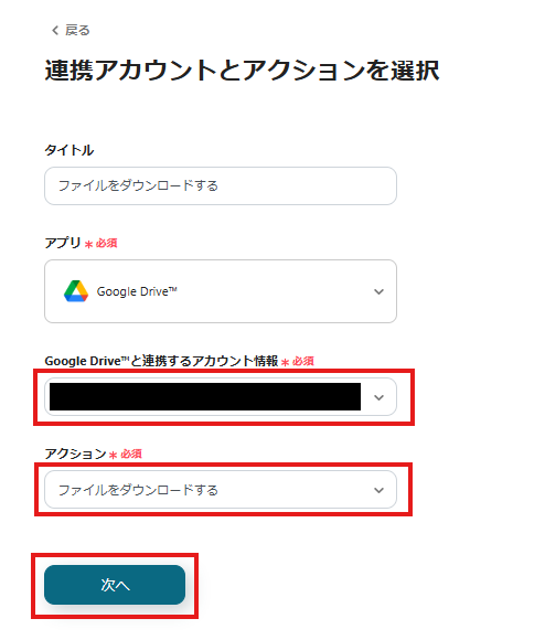 トリガーアクションが「ファイルをダウンロードする」になっていることを確認し、次へ進みます。