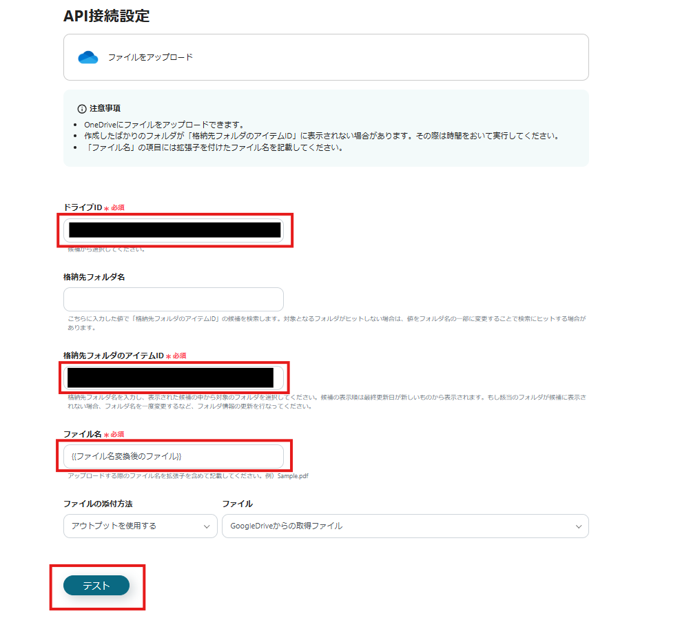 「ドライブID」と「格納先フォルダのアイテムID」を入力します。