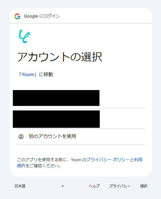 Yoomがアカウントへのアクセスを求めますので、「すべて選択」し、「続行」をクリックしたら、登録完了です。