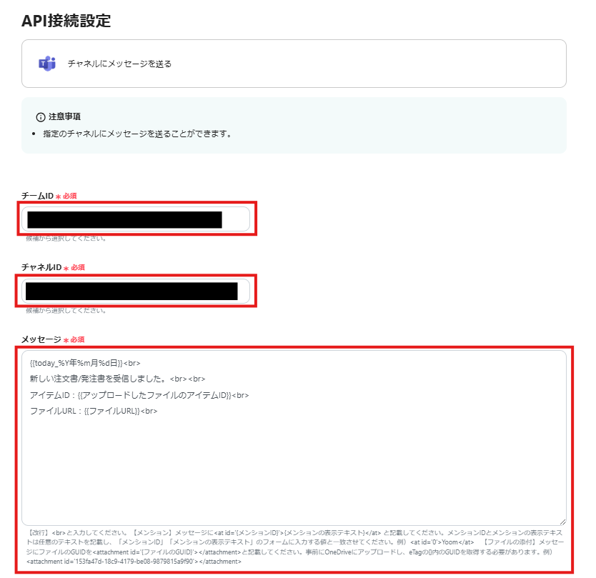 次にメッセージの内容を設定します。今回は通知が届いた日時とアップロードされた「アイテムID」とファイルのURLを記載するようにしています。
