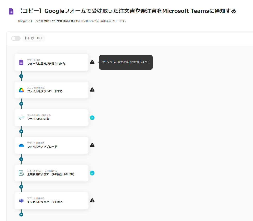 ・トリガーボタンをONにして、GoogleフォームとMicrosoft Teamsの連携動作を確認